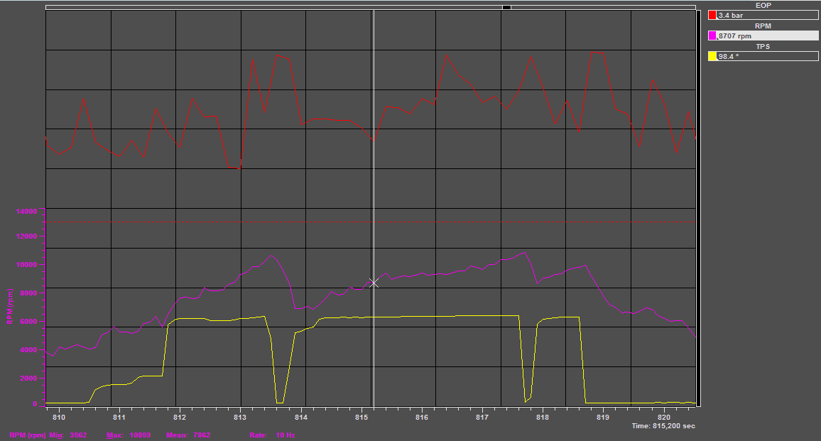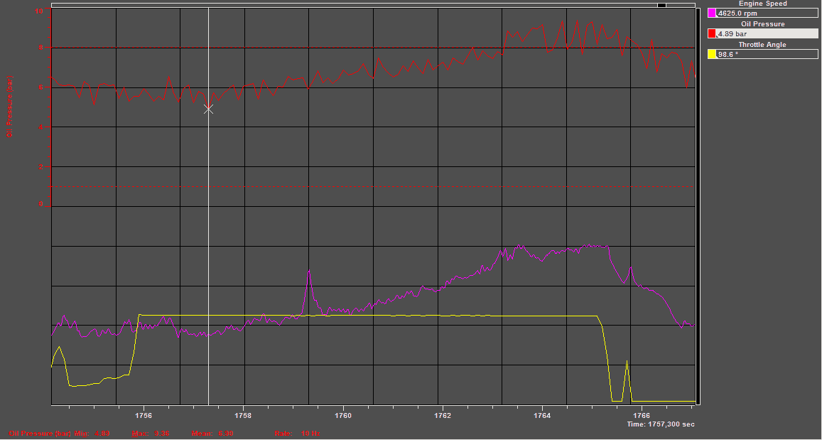 The first graph shows the data on track without the Spintric® hooked up, 2nd graph is with Spintric®. Top line is oil pressure and spikes. The Spintric® has all but eliminated the surges caused by air, and the mini spikes are normal oil pump fluctuations.
